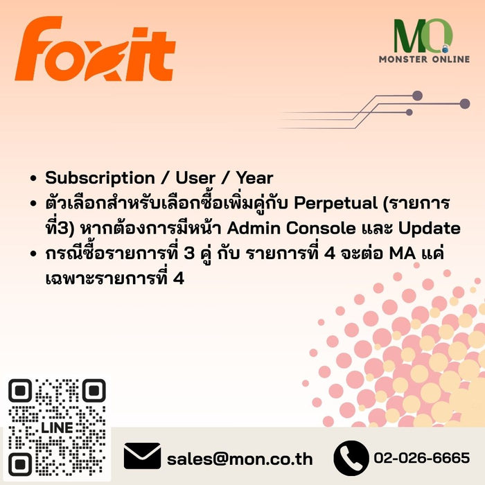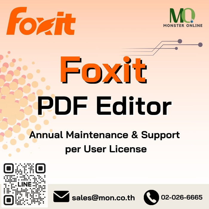 - กรณีซื้อ Foxit PDF Editor Perpetual คู่ กับ Foxit PDF Editor Annual Maintenance & Support per User License จะต่อ MA แค่เฉพาะ Foxit PDF Editor Annual Maintenance & Support per User License